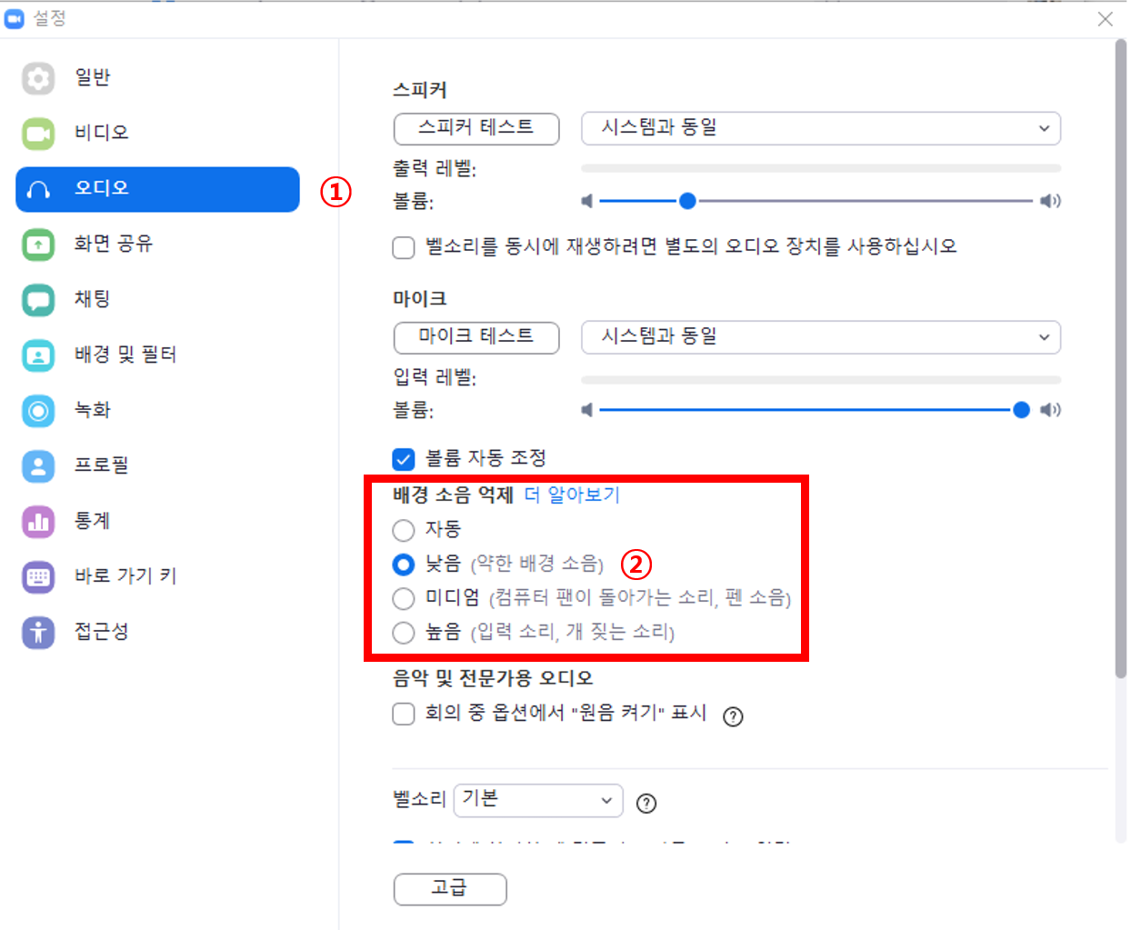 3. [오디오] 탭 - [배경소음 억제] - [낮음]에 체크합니다.